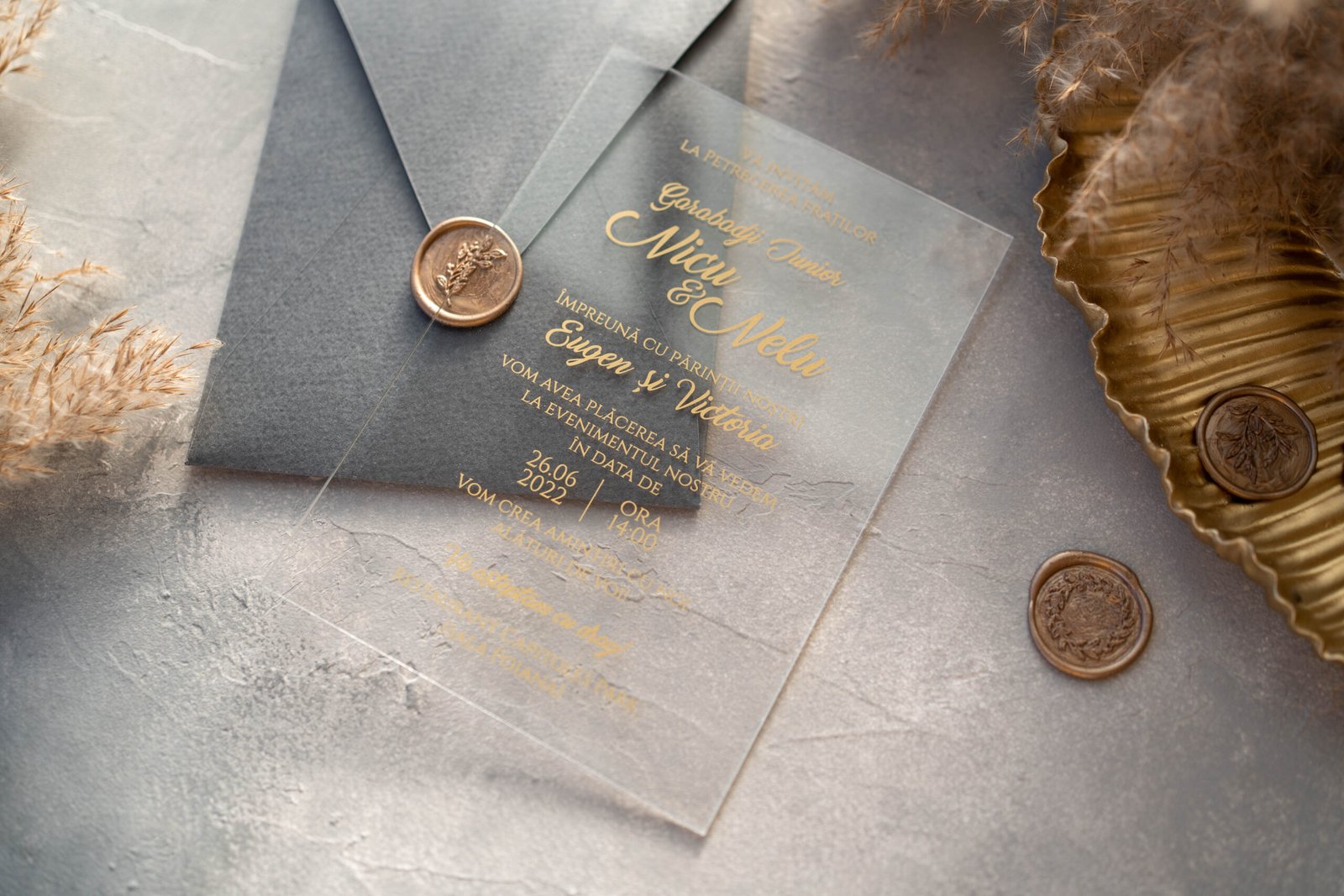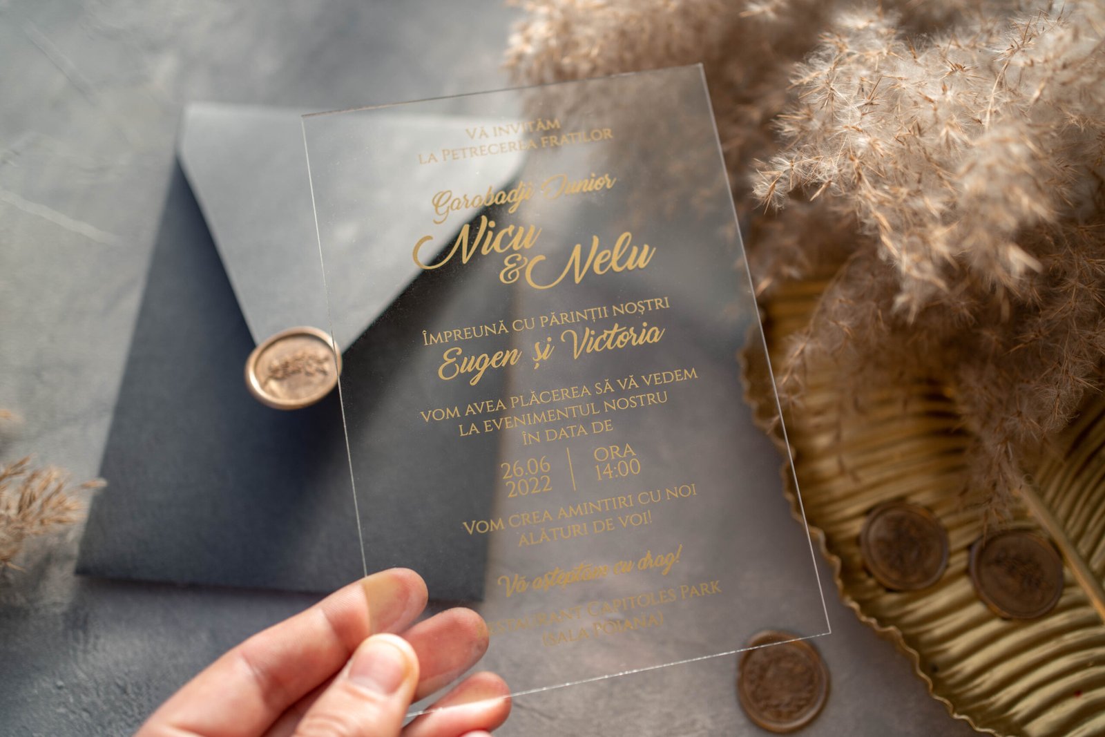 Invitație acrilică transparentă pentru cumetrie, cu text auriu aplicat pentru un efect sofisticat și memorabil. Realizată din material premium, cu finisaje impecabile și personalizare completă. Alegerea ideală pentru o cumetrie elegantă, modernă și deosebită.