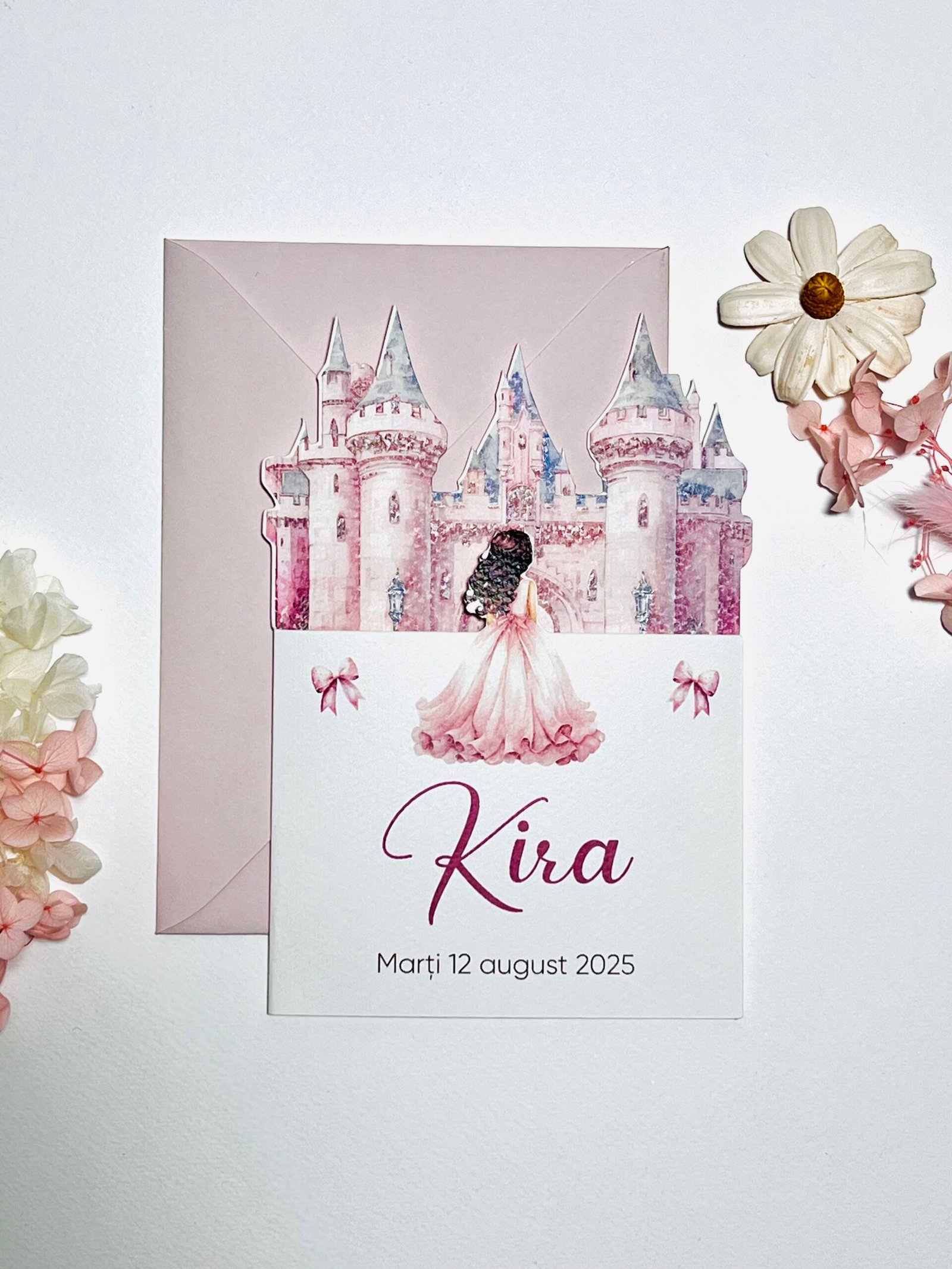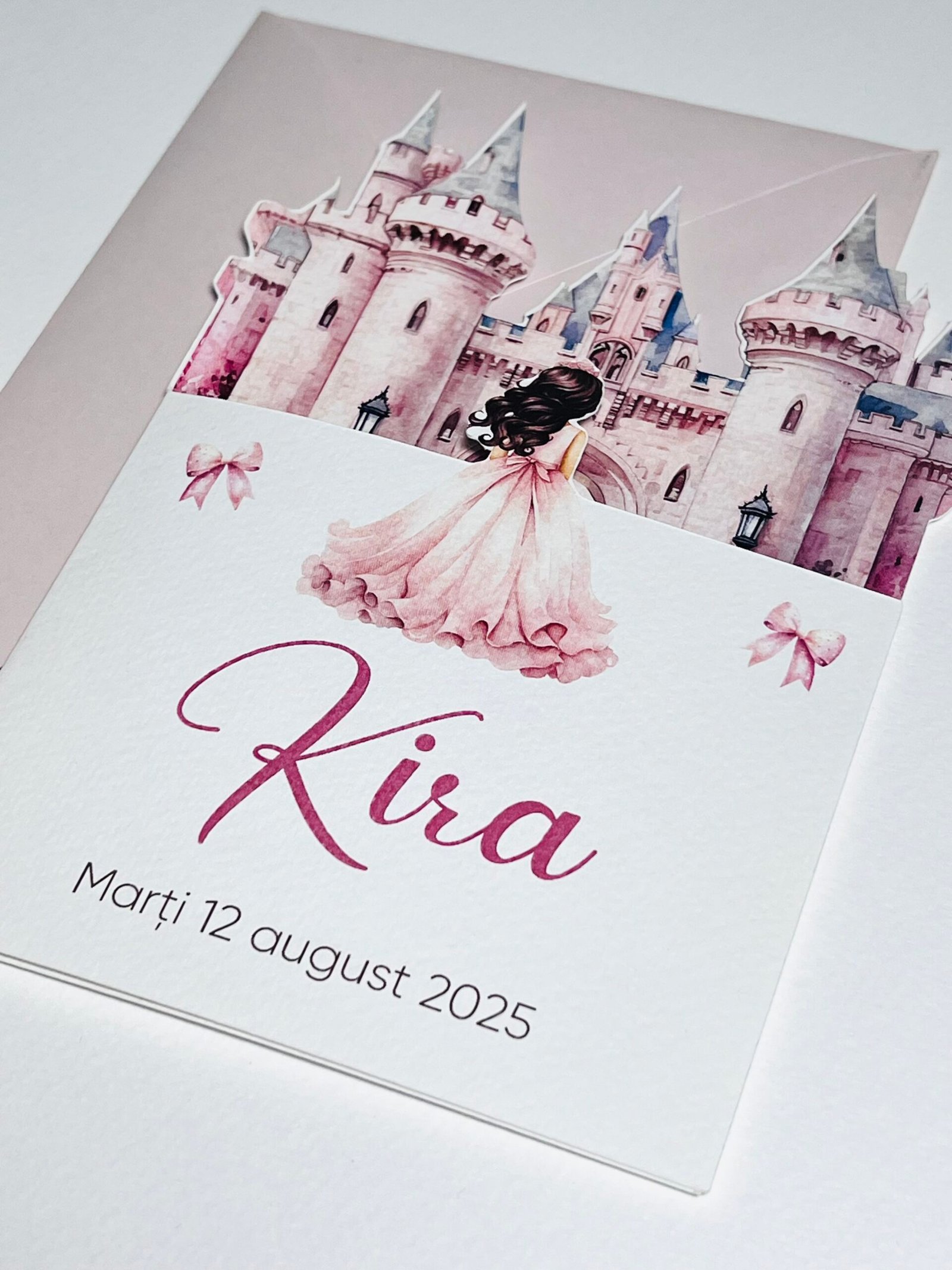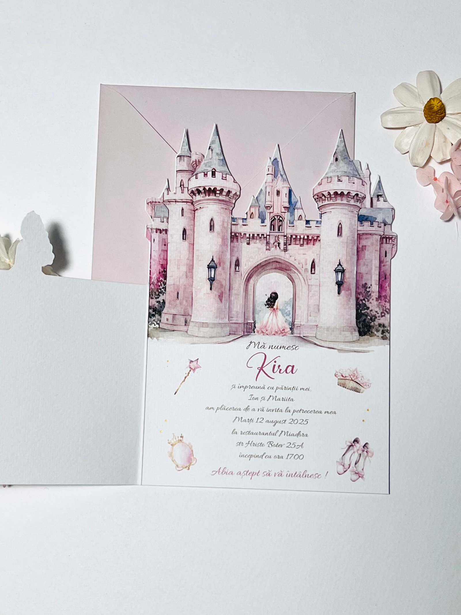Invitație de botez personalizată cu tematică de poveste, ilustrată cu castel și elemente grafice pentru fetițe. Include plic asortat și permite personalizarea completă a textului și datelor evenimentului. Potrivită pentru botezuri cu temă prințesă sau basm.