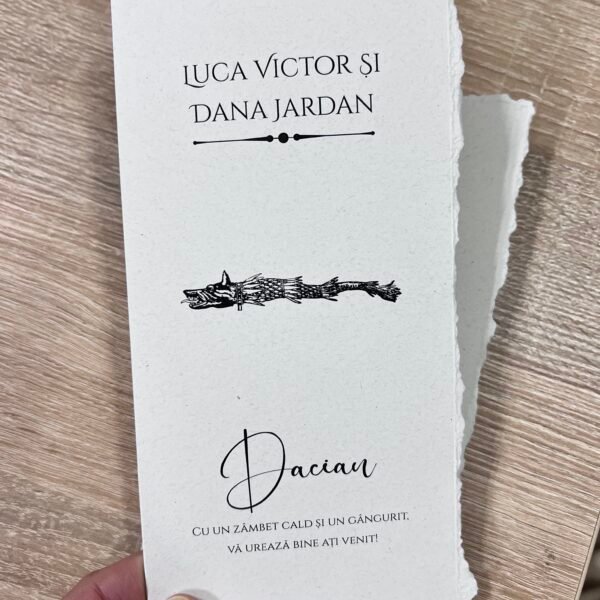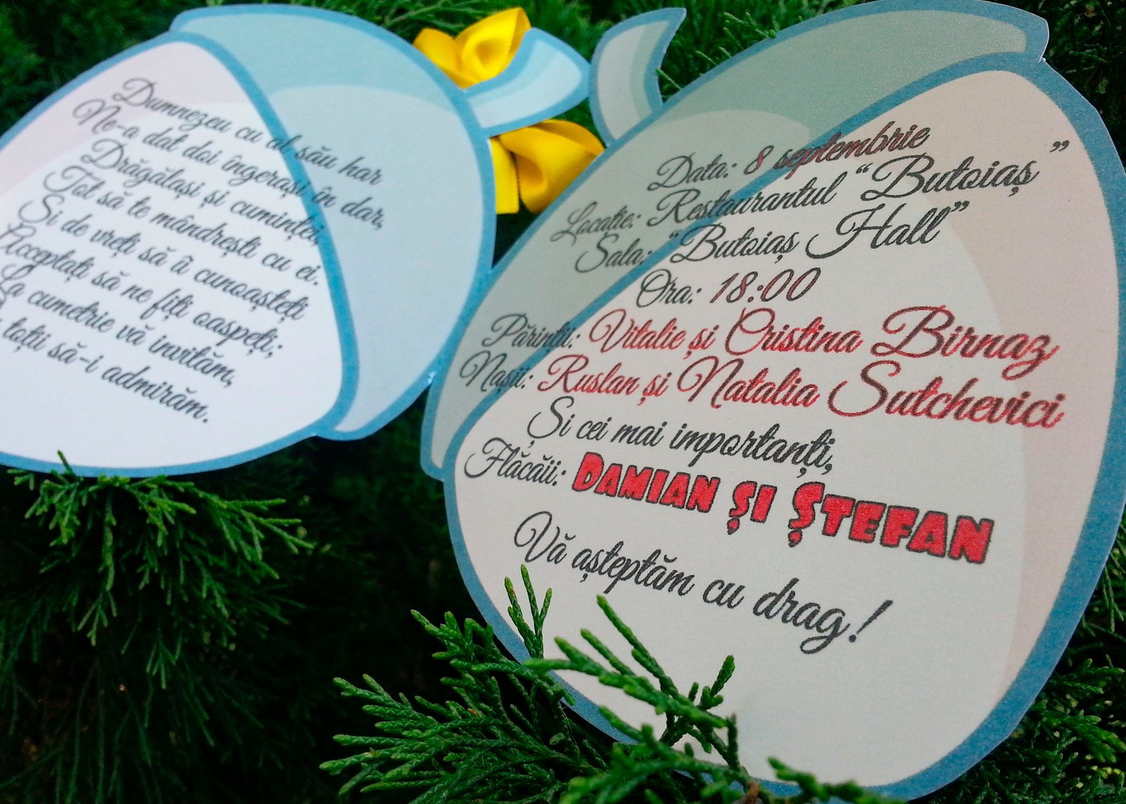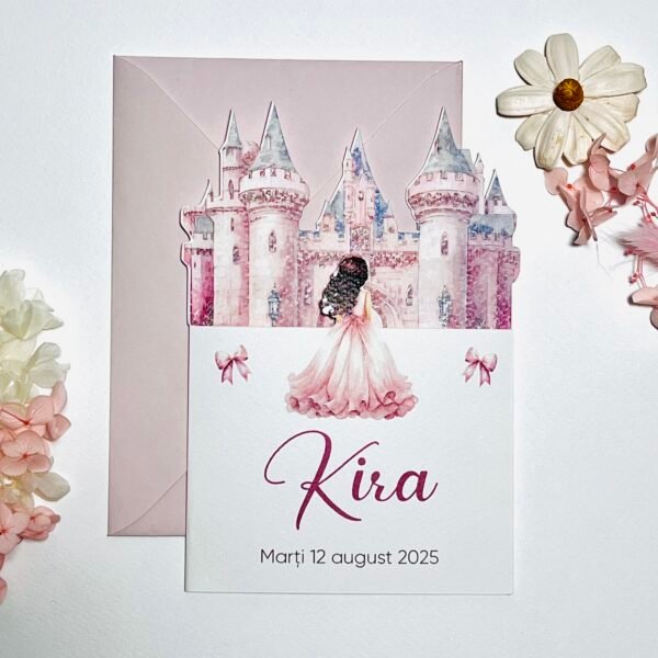Invitație de botez personalizată în formă specială, cu personaje animate și fundiță aplicată pentru un efect vizual mai atractiv. Designul este potrivit pentru evenimente cu tematică pentru copii. Se personalizează complet cu textul și detaliile evenimentului.